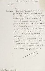 ensemble relAtif à lA succession du roi. L.S. par le conseiller de mArcol à La Galaizière à propos de la lecture des lettres patentes du roi (copie jointe) adressées à la Cour souveraine confirmant la continuation de ses fonctions (Nancy 28 février 1 766). 5 L.S. par le duc de choiseul (4 de sa griffe) à La Galaizière, à propos de l'exécution du testament du Roi Stanislas (1er mars- 6 avril 1766). Il compte sur son correspondant pour déposer le testament et le codicille au Greffe de la Cour Souveraine de Nancy, puis pour venir le rejoindre à Versailles afin de discuter des affaires de la Lorraine et du Barrois... Minute de réponse de La Galaizière (avril 1766) ; lettre du même au Greffe de la Cour Souveraine pour l'envoi des pièces en question (4 mars 1766) ; réponse à la demande d'aide de la veuve de l'un des grands valets de pied du roi défunt. 3 L.S. par le Contrôleur général des Finances François de l'Averdy à La Galaizière, à propos des levées de scellés apposés dans les résidences du roi, du maintien des appointements des sujets de la Maison du Roi, et de la gestion par Alliot des recettes et dépenses relatives aux dernières volontés du Roi (22 mars-1 0 avril 1 766). 2 P.S. par le même : État des pensions que le roy veut bien accorder à M. de la Galaisiere, chancelier du feu Roy de Pologne, aux commis du sceau et aux membres et autres officiers des conseils d'État, de finances, et commerce qui avoient été établis en Lorraine par S. M. Polonoise (Versailles 17 mars 1766, avec brouillon corrigé), et document concernant la Compagnie des Gardes du Corps. 3 minutes de réponses de La Galaizière. on joint 6 imprimés : 2 lettres patentes pour la prise de possession des duchés de Lorraine et de Bar (février 1766), 3 arrêts de la Cour souveraine de Lorraine et Barrois pris après la mort de Stanislas (février-avril 1766), et l'inscription funéraire en latin sur son mausolée ; plus la fin d'un acte notarié (grosse du 30 mai 1752 à Nancy), pour la bourse de secours que Stanislas mit en place pour le corps des marchands de Nancy.
