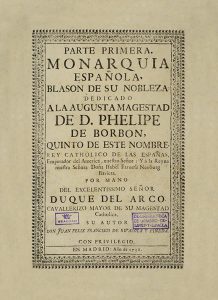 Rivarola Ypineda (Juan Felix Francisco de). Monarquia Espanola, Blason de su Nobleza. Madrid, Alonso Mora, 1736. 2 volumes in-folio, veau vert, guirlande dorée, armes au centre du premier plat, dos orné, armes en pied (Reliure moderne). Édition...