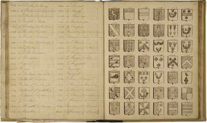 l'ouvrage forme les pp. 1-73, qui comprennent les blasons de 1546 familles, rangés par ordre alphabétique : les noms se suivent sur le feuillet de gauche, les armoiries ont été dessinées en regard, sur le feuillet de droite. On y joint une lettre manuscrite datée du 29 septembre 1787, expédiée de La Rocheguyon, et concernant des titres nobiliaires des différentes branches d'une même maison ; la fin du bifeuillet manque, et donc on ne connaît ni le signataire, ni le destinataire.