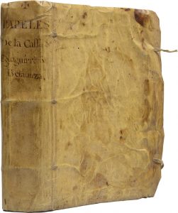 [Eguaguirre Ybalaunza]. Papeles de la Casa Eguaguirre ybelaunza. S.l.n.d. Fort volume in-folio, vélin souple à lacets, dos lisse, gardes refaites (Reliure de l’époque). Manuscrit de [460] ff. copiés par différentes mains, avec 3 tableaux...
