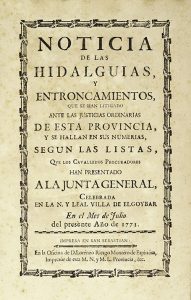 [Guipuzcoa]. Noticia de las hidalguias yentroncamientos, que se han litigado ante las justicias ordinarias de esta provincia, yse hallan en sus numerias, segùn las listas, que los cavalleros procuradores han presentado ala Junta general, celebrada...