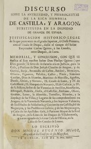 Munoz (Miguel Eugenio). Discurso sobre la antiguedad, yprerogativas de la Rica Hombria de Castilla, yaragon, substituida en la dignidad de Grande de Espana. Madrid, 1736. In-folio, veau aubergine, guirlande dorée, armes au centre du premier plat,...