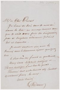 Alexandre Dumas (père). 1802-1870. Ecrivain. L.A.S. à son cher Dutart. S.l.n.d. 1 pp. in-8. Dumas presse son libraire de lui trouver les livres qu’il a demandés pour l’aider à écrire son prochain roman ; (...) Un ouvrage comme celui que je...