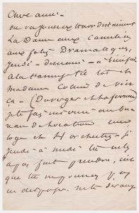 Dame aux Ca- mélias aux Folies Dramatiques, jeudi, demain. Cela t’amuse t-il toi et madame C* de vois ça (Duverger et Lafferriére). Il lui réserve une loge au bureau de loca- tion. Si jeudi à midi, tu ne les a pas fait prendre (.), ne te dérange aucunement, il ya foule pour les prendre. C’est pour cela que je te les offre (.). Joint une lettre pour la réservation d’une loge ; Tu es sur la liste depuis longtems, mais quelle liste ! Nous ne savons plus où donner de la tête. Ton frére aussi demande une loge. Il faut en sacrifier un. Lequel ? (.).