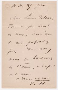 Victor Hugo. 1802-1885. Ecrivain. L.A.S. « V.H. » à Louis Blanc. H.H. (Hauteville House), 25 juin. 1 pp. bi-feuillet in-8, blason en coin. Bel envoi à son confrère en exil : (...) Etre un peu aimé de vous, c’est une de mes profondes joies....