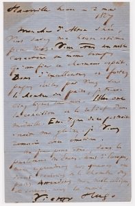 ancien collègue de la Chambre des Pairs ; (...) Vous êtes un noble caractère en même temps qu’un fier et charmant esprit. Dans d’excellentes et fortes pages écrites par vous sur la Chambre des Pairs, je trouve cinq lignes sur moi. Elles ont la concision et le relief d’une médaille. Etre digne de ce portrait serait ma gloire (...). Un jour peut-être, dans le parlement des Etats-Unis d’Europe, nous reprendrons nos graves et douces causeries de la Chambre des Paris. Attendons, mon noble collègue (...).