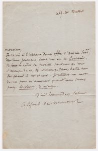 Alfred de Musset. 1810-1857. Ecrivain poète. L.A.S. (à son éditeur). S.l.n.d. 1 pp. in-12. Instructions du poète qui renvoie des épreuves cor- rigées ; Il y a encore dans ces épreuves, beaucoup de corrections. Je prie qu’on y fasse grande...