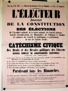 Fondateur de la pre- miére compagnie d’assurances à Paris, a fondé et doté la Caisse d’épargne... • GOUPY, Louis. Aux électeurs du département de la Seine... [1848]. 1f. 43x59 cm. Proclamation hostile à Garnier-Pagés, Ledru-Rollin, Marie, Arago et Lamar- tine. • GRANDMENIL. Candidature démocratique. - Droit, Pain, Honneur, Solidarité. - Travailleurs, électeurs du département de la Seine. [1848]. 1f. 43x62 cm, Pro- fession de foi d’un démocrate socialiste ami notam- ment de Louis Blanc et de Flocon. • LECHEVALIER, Victor. République Française. - Aux électeurs de la Seine. - [1848]. 1f. 43x67 cm. Profes- sion de foi d’un ancien éléve de l’École Polytech- nique. Imprimé sur papier bleu. • LEBRUN, L. Aux commerçants et fabricants-loca- taires du département de la Seine. -Candidature à l’Assemblée Nationale d’un membre chargé spécia- lement des intérêts des commerçants dans les rap- ports avec les propriétaires Réforme suivante : révision de baux, révocation de la clause abusive, abolition de pot de vin... Enseignement public et gra- tuit avec concours à tous les degrés. [Signé] Lebrun, commerçant. [1848]. 1f. 42x62 cm, Imprimé sur pa- pier bleu.