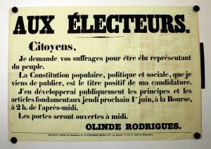 1849. Frères et collègues de la Montagne, quoique au secret le plus rigoureux et totalement privé de journaux, nous apprenons, par nos amis Brives et Gambon la liste que vous avez arrêtée pour l’élection du 8 juillet et concurremment avec le « Co- mité Démocratique Socialiste », le « Comité Démo- cratique des Amis de la Constitution », les « délégués des corporations ouvrières réunies », et ceux de la « Presse Démocratique »... Votez tous comme un seul homme il y a va du salut de la Ré- publique ! [Signé : ] Deville, Hautes-Pyrénées ; Brives, Hérault... P., Impr. Lange Lévy, 1849. 1f. 62x84 cm, imprimé sur papier vert. • Les Représentants de la Montagne, le Comité Dé- mocratique Socialiste, le Comité Démocratique des Amis de la Constitution, les délégués de la Presse Démocratique, les délégués des corporations ou- vrières. Au peuple. Citoyens, Toutes les nuances du Parti Républicain... qui représentent une force, se sont unies pour arrêter une liste unique de candidats (.). Liste républicaine : Charassin, Demay..., Flocon, ... Vidal... P., Impr. Lange Lévy, s.d. 1f. 60x84 cm, im- primé sur papier rose. • Union républicaine. - La lutte existe entre Répu- blicains et les Royalistes ; elle existe entre ceux qui veulent le progrès sincères des principes de li- berté, d’égalité, de fraternité (.). Liste des candi- dats :Guinard, exreprésentant ;Buvignier, ex-représentant ; Emile de Girardin, Favre, Lesseps, Ribeyrolles, rédacteur en chef de La Réforme... P., Impr. central des chemins de fer Napoléon Chaix, s.d. 1f. 42x61 cm, [s. d.].Imprimé sur papier rose. • Association Démocratique des Amis de la Consti- tution. P., Typographie et lith. Félix Malteste, (s.d.). 1f. 62x85 cm, Imprimé sur papier rose. Liste des candidats du parti démocratique avec Arago, Carnot, Cavaignac, Dupont de l’Eure, Favre, Grévy , La- grange, Lamartine, Lamoricière, Lasteyrie, Ledru- Rollin, Marie, etc. • Droits de l’Homme. Deux Consuls. Une Assemblée. - Contre-projet de Constitution avec exposé des mo- tifs, par un citoyen français. 1f. 31x42 cm, [1848]. Exemplaire d’épreuve avec « bon à tirer » manuscrit. Imprimé sur papier rose.