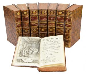Paris, Rollin et De Bure, 1741-42. 7 tomes en 8 volumes in-12 de [2]-26- 330 ; [6]-333 à 542-252 (catalogue) ; 16- 584 ; [16]-664 ; 24-732 ; 12-676 ; 26-701 ; 15-653-[3] pages, veau marbré, dos à nerfs ornés de rosettes dorées, tranches rouges (Reliure de l'époque). Troisième édition ; elle est illustrée d'un beau frontispice gravé montrant l'auteur dans son cabinet, et de 15 mappemondes et cartes gravées toutes dépliantes. Le précieux catalogue de 252 pages intitulé : Catalogue des meilleures cartes géographiques générales et particulières , est placé à la fin du second volume. Petits accidents aux coiffes, sans gravité. La pièce de tomaison du troisième tome est manquante.