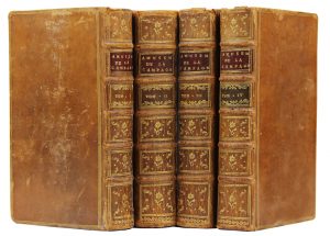 Nouveaux Amusemens De La Campagne ou Récréations historiques avec quelques anecdotes secrettes et galantes. Paris, sans nom, 1743. 4 volumes in-12 de [4]-445 ; [4]-568-[2] ; [2]-551 ; [2]-548 pages, veau blond, triple filet doré sur les plats, dos...