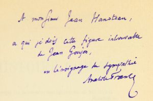 EDITION ORIGINALE. L'un des 100 exemplaires numérotés (6) sur Hollande, complet des 24 pages de notes de M. Goubin, comprises dans la pagination et que l'on ne trouve que dans le tirage en grand papier. Exemplaire avec un bel envoi manuscrit signé de l'auteur à Jean Hanoteau, attaché au service historique des ministères de la guerre et des affaires étrangères : « A Monsieur Jean Hanoteau à qui je dois cette figure introuvable de Jean Goujon, en témoignage de ma sympathie ». En outre l'exemplaire est enrichi d'un billet manuscrit signé d'A. France adressé à Noël Charavay. Le dos de la reliure est uniformément passé, l'exemplaire a conservé ses témoins d'origine