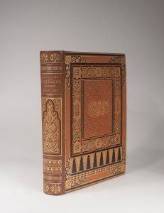 Davillier (Baron Charles). Gustave Doré. L’Espagne. Paris, Hachette et Cie, 1874. Grand in-4, demi-chagrin brun foncé, plats de chagrin fauve ornés d’une large plaque à décor mauresque doré et noir, signée A. Souze, dos à nerfs orné,...