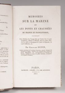 Dupin (Charles). Mémoires sur la marine et les ponts et chaussés de France et d’Angleterre. Paris, Bachelier, 1818. In-8, demi-basane havane, dos lisse orné, pièce de titre rouge (reliure de l’époque). Ex-libris gravé L. de Montaignac....
