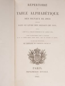 Dussault (capitaine de corvette). Répertoire ou tableau alphabétique des signaux de jour. Paris, Imprimerie royale, 1841. In-8, veau blond, dos lisse orné, très frotté.
