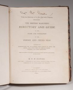 Elmore. The british mariner’s directory and guide to the trade and navigation of the Indian and China seas. Londres, Bensley, 1802. In-4, veau brun à coins, dos lisse orné (reliure de l’époque). Portrait-frontispice. Ex-libris manuscrit...