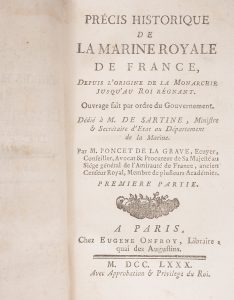texte dépliantes. Ex-libris Montaignac. Petites mouillures marginales, galeries de vers sur quelques feuillets. Frottements et manques aux plats. Dos passé. Joint : PONCET DE LA GRAVE. Précis historique de la marine royale de France. Paris, Onfroy, 1780. 2 parties en un volume in-12, demi-basane bleu, dos lisse orné, pièce de titre rouge (reliure du XIXe siècle). Plats frottés.