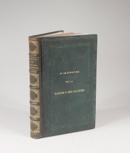 Catalogue général des produits exposés. Paris, Lahure, 1875. In-8, demi-chagrin vvert, dos à nergs orné, tranches dorées (reliure de l'époque). Sur le premier plat en lettes d'or, « monsieur le ministre de la marine et des colonies ».