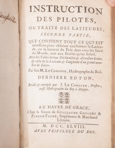 Le Cordier (Samson). Instruction des pilotes. Au Havre de Grace, Veuve Gruchet, Pierre Faure, 1748. 2 parties en un volume in-8, vélin souple de l’époque. Nouvelle édition corrigée par Jacques Le Cordier. Tableaux et figures dans le texte....