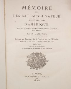 Marestier. Mémoire sur les bateaux à vapeur des États-Unis d’Amérique. Paris, Imprimerie royale, 1824. In-4, demi-basane violette, dos lisse orné, pièce de titre rouge. Ex-libris Montaignac. Dos passé, pièce de titre frottée.