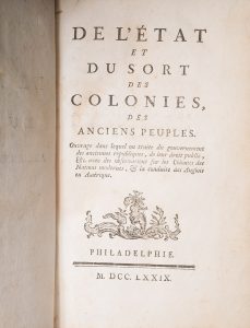 [Sainte Croix (Baron de)]. De l’état et du sort des colonies des anciens peuples. Philadelphie (Paris), 1779. In-8, vélin de l’époque. Edition originale de cet ouvrage traitant du gouvernement des anciennes républiques, de leur droit...