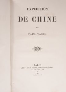 Varin (Paul). Expédition de Chine. Paris, Michel Lévy, 1862. In-8, demi-basane brune, dos lisse orné (reliure de l’époque). 4 planches dépliantes. Ex-libris Gueutteville. Dos frotté.