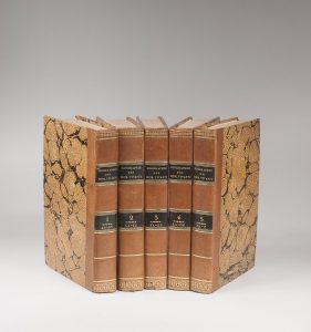 Biographie des hommes vivants. Paris, Michaud, 1816. 5 vol. in-8, demi-veau havane, dos lisse orné, pièces de titre et de tomaison bleues. Ex-libris Gueutteville. Accrocs aux coiffes.