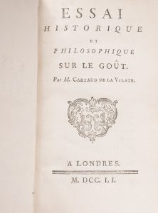 Cartaud De La Vilate. Essai historique et philosophique sur le goût. Londres, 1751. In-12 de veau tacheté, dos à nerfs orné, pièce de titre beige. Nouvelle édition de cet essai paru en 1736, abordant entre autres le vin et le luxe.