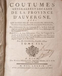 Chabrol. Coutumes générales et locales de la province d’Auvergne. Riom, Desgoutte, 1784. 4 vol. in-4, veau brun, dos à nerfs orné, reliure de l’époque très fatiguée.