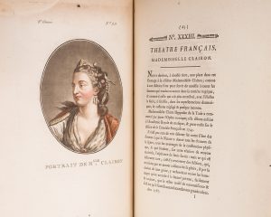 complète, de cette publication sur les théâtres et acteurs parisiens, parue de 1786 à 1791 . Elle comprend 48 planches de costumes numérotées, aquarellées à l'époque, en couleurs pour la plupart et certains à la manière de lavis, une planche de mécanique théâtrale et 2 feuillets de musique gravés. Rousseurs, taches importantes à certains feuillets. Frottements au dos. Ex-libris moderne Yves Refoulé. Cohen de Ricci, 226.