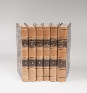 Crétineau-Joly. Histoire religieuse, politique et littéraire de la compagnie de Jésus. Paris, Mellier, 1844-1846. 6 vol. in-8, demi-veau fauve, dos lisse orné, pièces de titre et de tomaison noires (reliure de la fin du xixe siècle). Première...