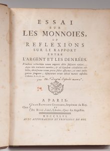 [Dupre De Saint-Maur]. Essai sur les mon-naies, ou Réflexions sur le rapport entre l’argent et les denrées. Paris, Coignard, 1746. In-4, veau, dos à nerfs orné, pièce de titre en maroquin rouge (reliure de l’époque). Édition originale,...