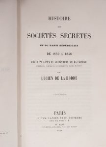 La Hodde. Histoire des sociétés secrètes et du parti républicain de 1830 à 1848. Paris, Julien, 1850. In-8, demi-veau violet, dos lisse orné. Édition originale de cet intéressant ouvrage sur les sociétés secrètes de la Monarchie de Juillet...