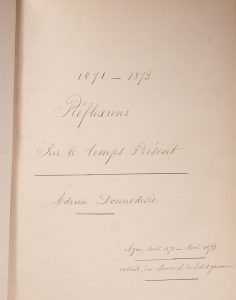 Manuscrit. — Donnodevie (Adrien). Réflexions sur le temps présent. 1871-1873. In-4, demi-veau havane, dos à nerfs orné, pièce de titre grenat, date en bleue. 246 pages d'une écriture très lisible. Rédigé à Agen, entre aout 1871 et mai...
