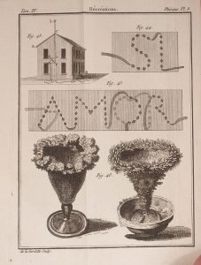 et de nombreux schémas dans le texte. Cet ouvrage de mathématiques et de physiques comprend également un Traité des horloges et une dernière partie consacrée à la prestidigitation (Tours de Gibecière). Bel exemplaire. Coiffes frottées.