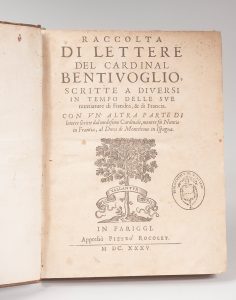 Raccolta Di Lettere del Cardinal Bentivoglio. Paris, Pierre Rocolet, 1635. In-4, plein veau, dos à nerfs orné (reliure de l’époque). Le Cardinal Bentivoglio, nonce apostolique, eut d'importantes responsabilités poli- tiques en Flandre et en...