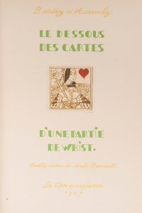 Barbey D’aurevilly (Jules). Les Dessous de cartes d’une partie de Whist. Paris, La Connaissance, 1927. In-8, demi-maroquin brun à coins, dos à nerfs orné, tête dorée, non rogné, couverture et dos (J. Van West). Première édition séparée,...