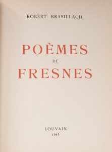 Brasillach (Robert). Poèmes de Fresnes. Louvain, s.n., 1945. In-8 carré, en feuilles sous couverture mauve rempliée imprimée en rouge et noir. Première édition complète de ce recueil de 25 poèmes, achevée d'imprimer le 12 novembre 1945....