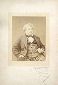 DUMAS (Alexandre). - Photographie originale d’Alexandre Dumas père, avec cachet à froid du photographe Pierre Petit, à l’adresse du 31 , place Cadet, à Paris (250 x 195 mm environ).