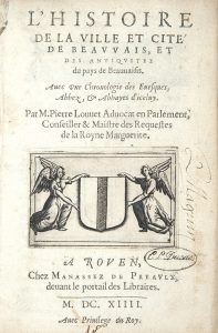 LOUVET (Pierre). L’Histoire de la ville et cité de Beauvais, et des antiquitez du pays de Beauvaisis, avec une chronologie des évêques, abbés et abbayes d’iceluy. Rouen, Manassez de Preaulx, 1614. In-12, vélin souple de l’époque.