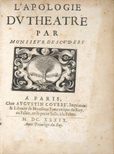SCUDÉRY (Georges de). L’Apologie du théâtre. Paris, Augustin Courbet, 1639. In-4, maroquin rouge, dentelle composée de fers en ostensoir, milieu doré, dos lisse orné, tranches dorées (Reliure de l’époque).