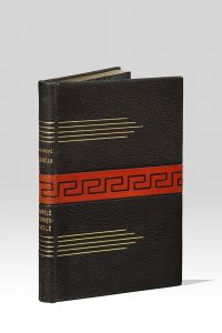 DUNCAN (Raymond). Poèmes de parole torrentielle. Paris, chez l’Auteur, 1927. In-8, maroquin noir, bande horizontale de maroquin rouge orné d’une grecque, jeux de filets dorés de part et d’autre, le tout passant sur le dos lisse, doublure et...