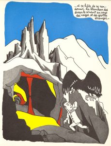 Édition originale et premier tirage de ce remarquable et célèbre album à transformation. L’illustration de Maurice Henry se compose de 32 planches en noir et en couleurs, ajourées pour la plupart. Un système de caches et de découpages permet, en jouant sur les formes et les couleurs, de modifier les décors, les personnages, et les compositions figuratives ou abstraites qui illustrent cette odyssée onirique. Le poète et illustrateur Maurice Henry, né en 1907, fut proche du Grand Jeu de René Daumal et des surréalistes. Exemplaire avec la couverture en second état. Le tirage, dont on ignore le chiffre exact, n’aurait pas excédé les 500 exemplaires. Petite déchirure à un montage.