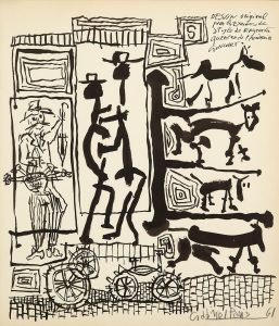 Édition avec le texte en calligraphie et les dessins « bruts » entièrement lithographiés par Gabriel Paris, dont 6 planches en couleurs. Tirage à 92 exemplaires sur papier d’Arches, celui-ci un des 75 signés par l’artiste, enrichi d’un dessin original d’Étude au crayon, un dessin original en noir et une superbe gouache originale représentant deux hommes qui se battent dans une rue sombre remplie de panneaux de signalisation routière.
