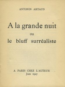 ARTAUD Antonin. À LA GRANDE NUIT OU LE BLUFF SURRÉALISTE. Paris, Chez L'Auteur, 1927. In-12 agrafé.