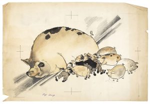 Dessin original à l'encre rehaussé au fusain et à l'aquarelle, réglé, satirique représentant une truie gavant des capitalistes au détriment des porcelets. Tampon de la revue Crocodile au verso. (léger manque de papier dans une marge).