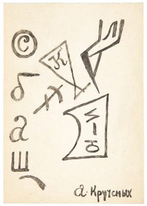 Dessin original à la gouache noire sur papier, signé au recto par Krucshenykh, comportant un jeu de lettres dans la composition abstraite. Kruchenykh est considéré comme l'inventeur du langage Zaub, c'est l'un des plus importants poètes du Futurisme russe, mouvement incluant sa femme Olga Rozanova, Maiakowski, Burliuk et Khlebnikov.