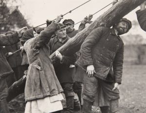 Tirage argentique d'époque titré, daté et signé au verso par Shaiket représentant l'installation des poteaux électriques dans le village de Botino, aux alentours de Kashira, dans le cadre du plan de GOELRO, premier plan de redressement économique des Soviets, en 1925. C'est le seul tirage original connu de cette photo d'Arkady Shaiket.