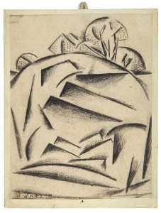 Dessin original au fusain sur papier contrecollé sur carton, figurant un paysage représentatif du futurisme russe, signé au recto par Shifrin. (restauration à un angle supérieur). Shifrin (1892-1942), fut avant tout décorateur de théâtre, principalement pour le Théâtre central de l'Armée soviétique, mais aussi peintre et illustrateur de nombreux livres.