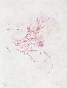 Gravure en rouge signée au recto par Bellmer, gravée par Cécile Deux de la série des Chants de Maldoror. Epreuve sur Japon Nacré tirée à 100 exemplaires numérotés.